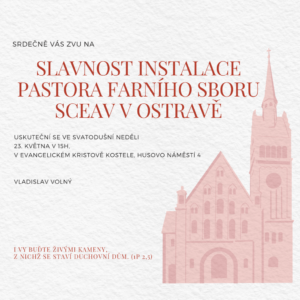Srdečně Vás zveme na slavnostní instalaci nově zvoleného pastora sboru Vladislava Volného, která se uskuteční ve Svatodušní neděli 23. 5. 2021 v 15 hodin v kostele.