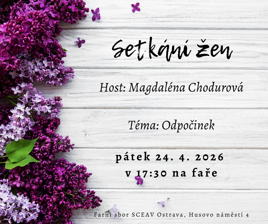 Srdečně zveme ženy a dívky na další setkání. Potkáme se v pátek 24. 4. 2026 v 17:30 hodin na faře, hostem bude Magdaléna Chodurová, která se s námi zamyslí nad zajímavým tématem, pro nás ženy velmi důležitým: Odpočinek. Těšíme se tedy opět na svědectví, společné sdílení, diskusi, modlitby i dobré občerstvení.