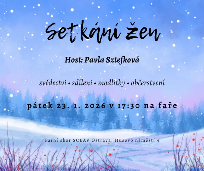 Srdečně zveme ženy na další setkání. Potkáme se v pátek 23. 1. 2026 v 17:30 hodin na faře a hostem bude Pavla Sztefková z Albrechtic, ředitelka Evangelizačního centra M.I.S.E. Těšíme se na společný požehnaný čas.